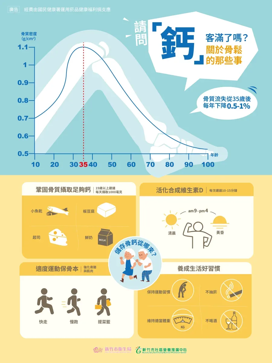 《請問鈣客滿了嗎?關於骨鬆的那些事》是為社區民眾設計的實體衛教海報,透過骨密度隨年齡變化的曲線,加上清楚好懂的骨頭圖像,讓大家一眼就能明白骨骼會隨著年紀慢慢流失。海報從日常生活出發,用簡單的方式告訴大家如何從吃的、動的到生活習慣,一步一步把骨鈣存起來。不論是怎麼補鈣、怎麼動才對骨頭好,內容都貼近日常、容易照做,幫助社區民眾提早認識、養成顧骨頭的好習慣,讓未來走得穩、站得久。